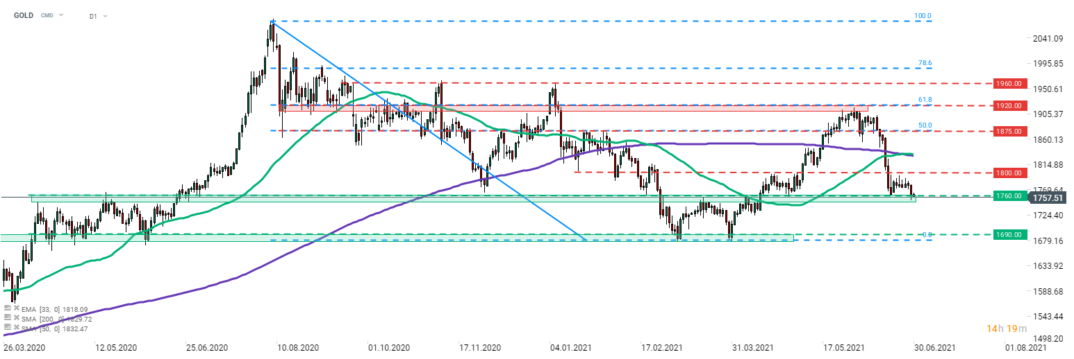 Zlato zaznamenalo za posledných pár dní prudký výpredaj, pretože výnosy v USA neustále rástli. Cena drahého kovu dnes dosiahla kľúčovú podporu - oblasť 1 765 dolárov, ktorá je označená 50% Fibo úrovňou rastového pohybu, ktorý začal v marci 2020 a minimom od novembra 2020. Prvý pokus o prelomenie pod touto prekážkou zlyhal, ale cena zlata sa neznížila a podarilo sa jej úplne zotaviť z dnešných poklesov. Môže sa však stať, že sa objaví ďalší pokus. Ak by sme videli zlom pod hladinu 1 765 dolárov, zostane otvorená cesta k ďalšej podpore, ktorá sa nachádza na úrovni 1 690 dolárov. -