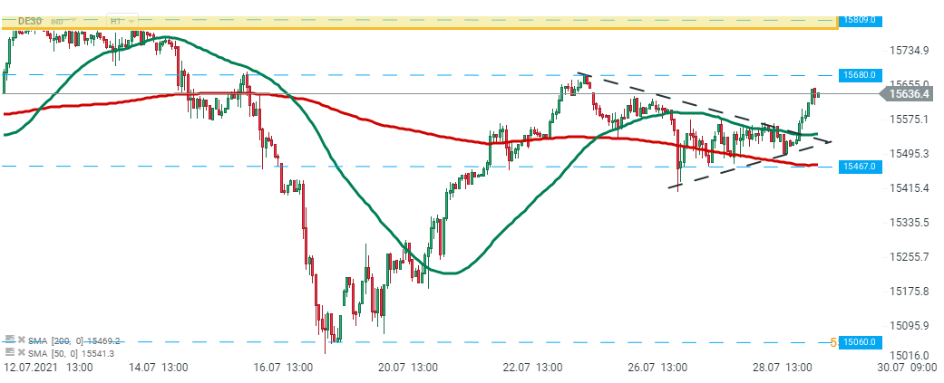 DE30 zaznamenal relatívne malú reakciu na dnešné zverejnenie údajov o inflácii z Nemecka. Index sa naďalej obchoduje len mierne pod hranicou 15 680 bodov. Zdroj: xStation5