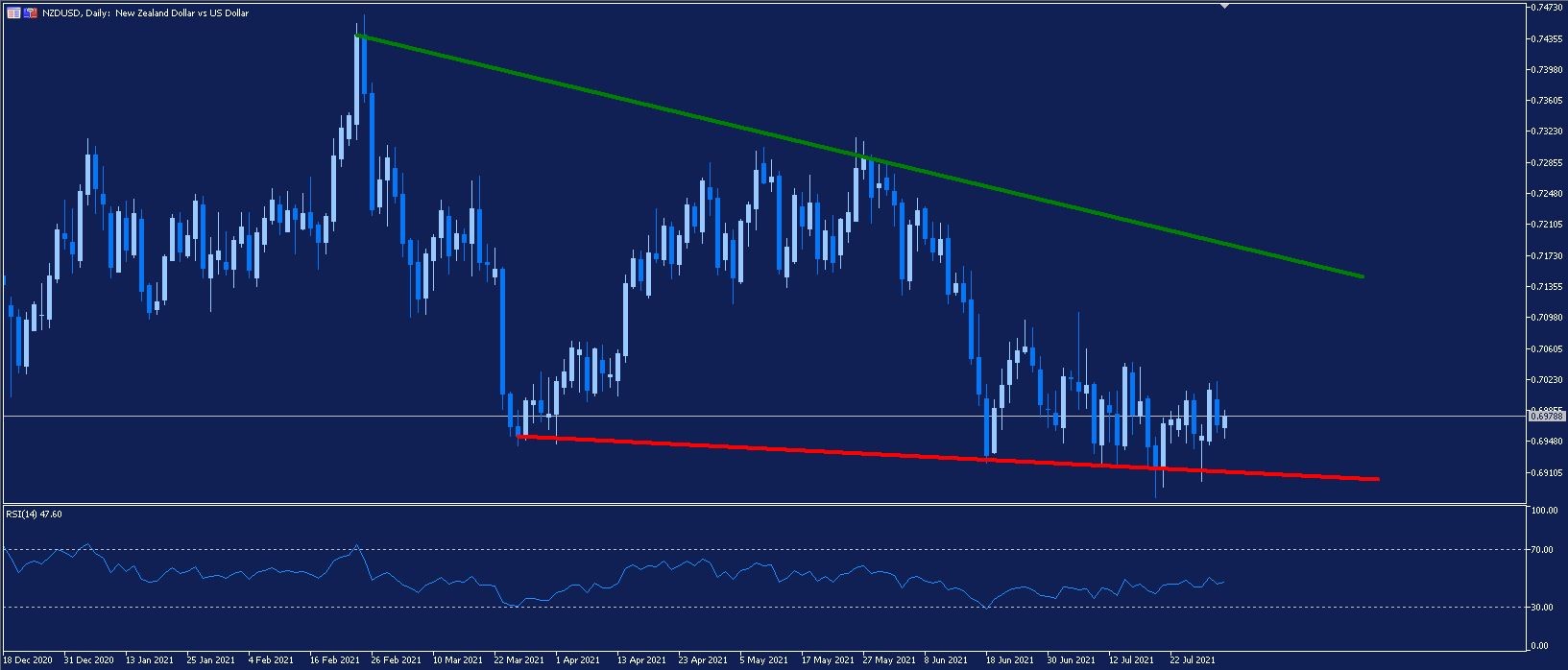 Na výše uvedeném denním grafu NZD/USD je jasně vidět, že od konce února tento měnový pár vytvořil klesající trojúhelník s klesajícím trendem.