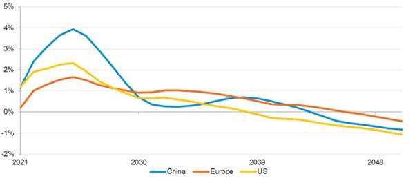 K dosažení čisté nuly do roku 2050 by trajektorie cen uhlíku musela být velmi strmá, od současných průměrných zhruba 3 USD za tunu přes 150-200 USD v polovině tohoto desetiletí až po 700-800 USD do roku 2050. Jak ukazuje následující graf, to by mělo významný dopad na inflaci. Neznámou zůstává, že rychlost a načasování jakéhokoli systému stanovování cen emisí závisí na politických opatřeních. Pokud se světoví lídři pokusí řešit změnu klimatu včas, bude zvýšení inflace v důsledku stanovení „cen uhlíku“ vyšší a dostaví se dříve. Jestliže to odloží, bude dopad na inflaci o něco menší, ale stále významný.