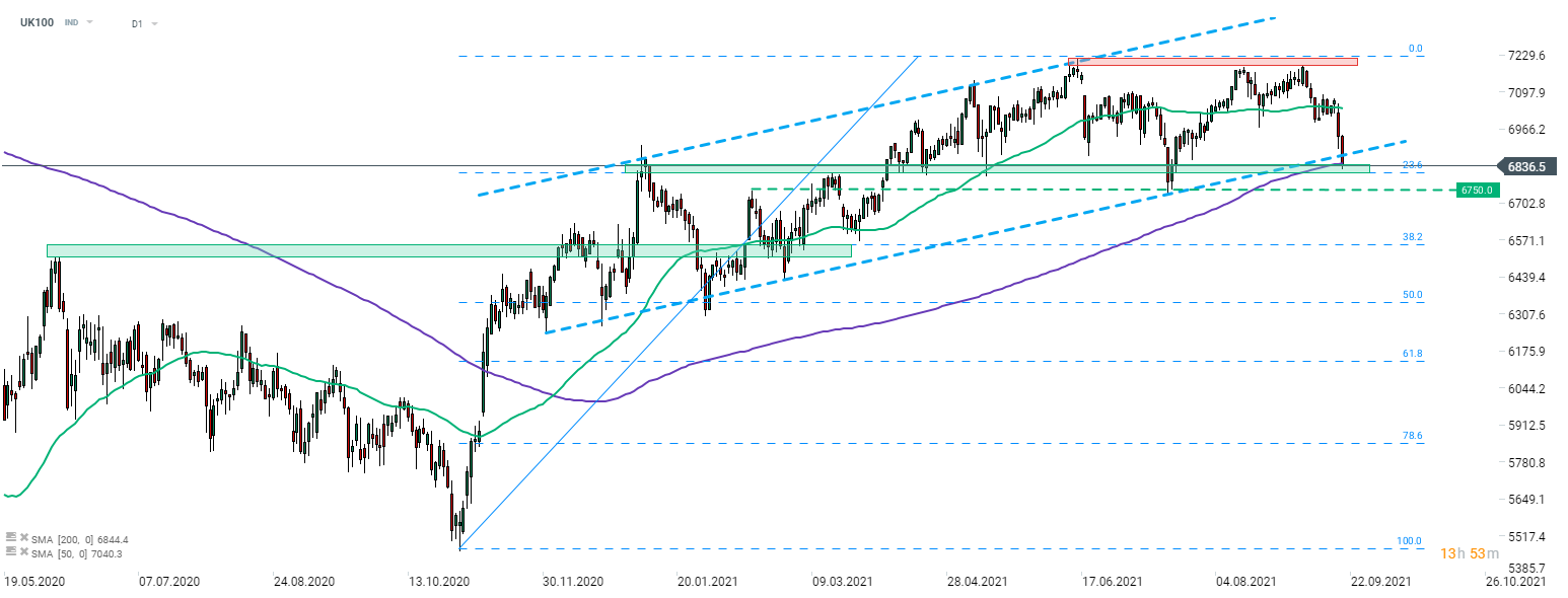 Obchodovanie v Európe bolo zahájené v negatívnej nálade - väčšina indexov blue chips zo starého kontinentu sa obchodovala o 1,5-2% nižšie. UK FTSE 100 (index UK100) je jedným z najlepšie fungujúcich európskych indexov, pretože klesá „iba“ o 1,4%. Pohľad na graf UK100 nám ukazuje, že index sa prelomil pod spodnú hranicu zostupného kanála a dosiahol najnižšiu úroveň od polovice júla. UK100 v súčasnej dobe testuje zónu podpory označenú 23,6% retracementom nedávneho vzostupného impulzu, ako aj kĺzavým priemerom s periódou 200. V prípade pokračovania poklesu môže hodnota klesnúť k júlovým minimám v oblasti 6 750 bodov.