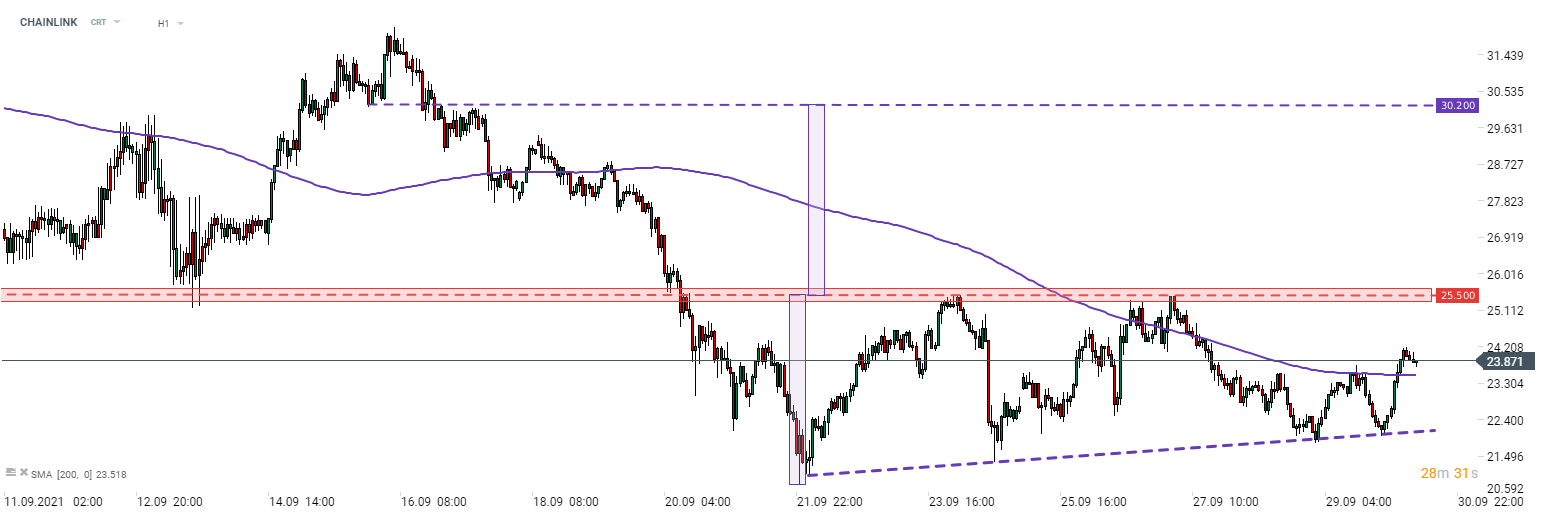 Kryptomene CHAINLINK sa cez noc podarilo prelomiť sa nad 200-hodinový kĺzavý priemer (purpurová čiara) a obchoduje sa blízko stredu nedávneho rozsahu. Najbližší silný odpor nájdete na hodnote 25,50 dolára a je označený hornou hranicou vzoru trojuholníka. Vymanenie sa zo vzoru smerom nahor by mohlo naznačovať posun k hladine 30,20 dolára. CHAINLINK však teraz mierne klesá a nemožno vylúčiť ani opakované testovanie vyššie uvedeného kĺzavého priemeru ako podpory.
