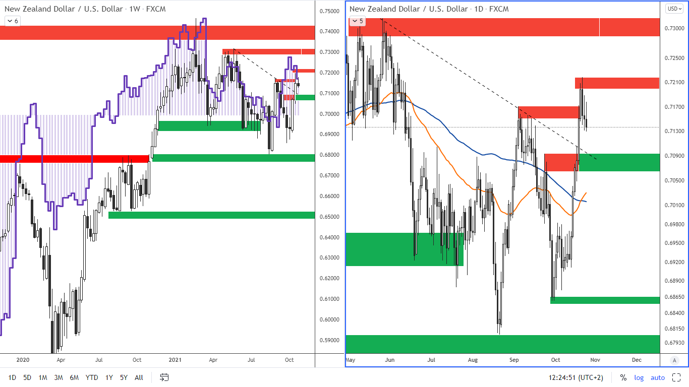 Novozélandský dolar v minulém týdnu posiloval a překonal rezistenci na 0.7170. Vytvořila se nová rezistence na 0.720, což je také nový vyšší vrchol. Zároveň klouzavý průměr EMA 50 se pohybuje nad SMA 100, což je býčí konstelace.