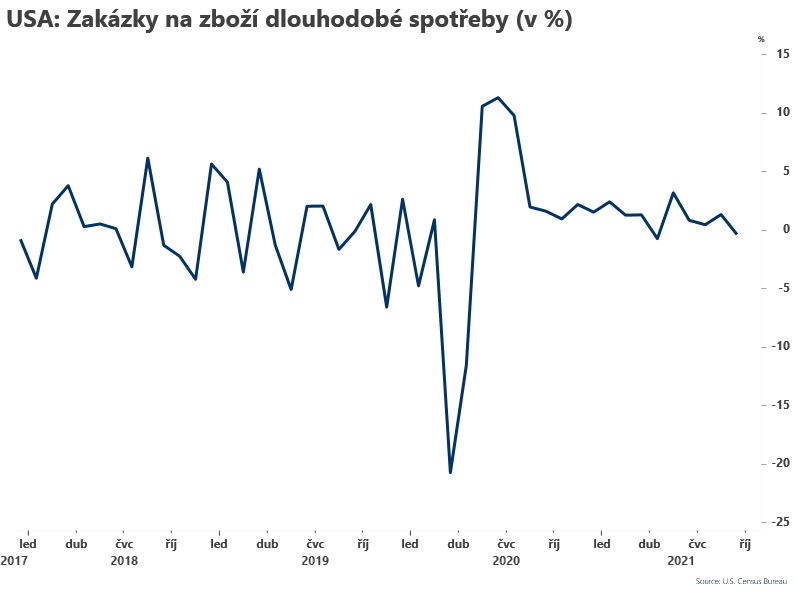 Zakázky na zboží dlouhodobé spotřeby v říjnu podle předběžných odhadů klesly na -0,5 % oproti revidovaným -0,4 % v září. Trhy naopak očekávaly růst na +0,2 %. -