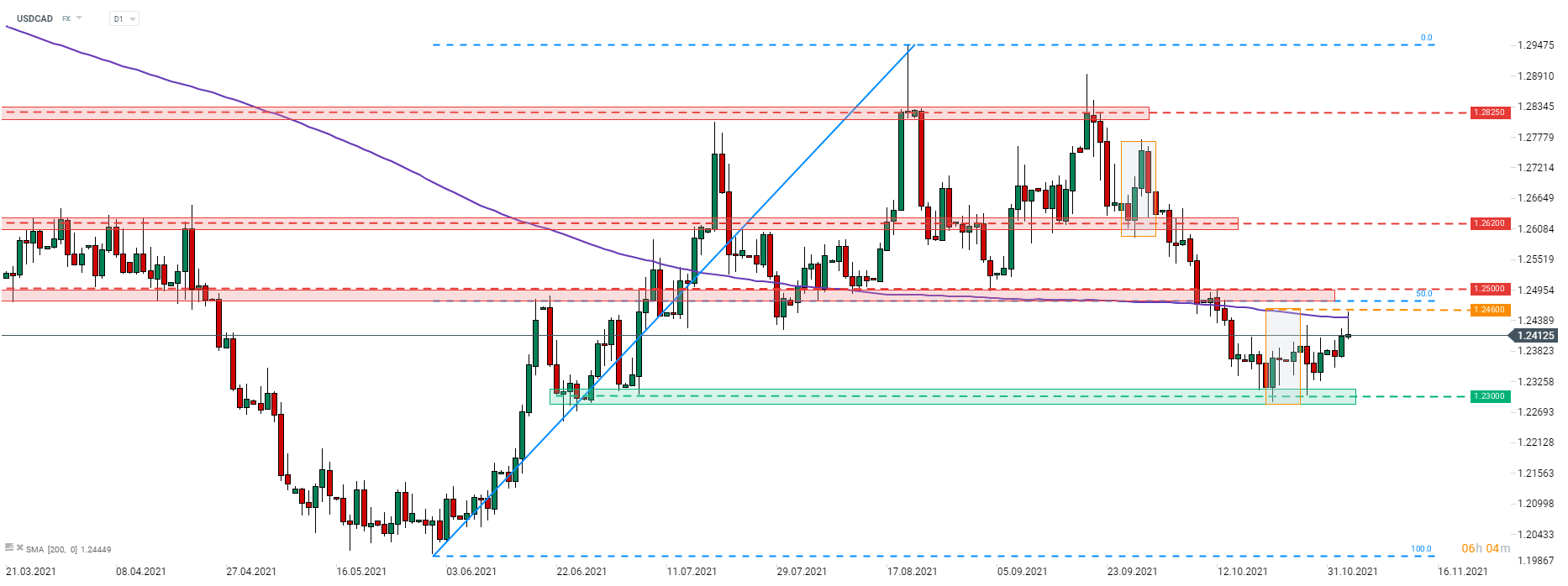 Pohľad na USDCAD v denných intervaloch ukazuje, že páru sa nepodarilo prekonať kĺzavý priemer s periódou 200, ktorý sa nachádza v oblasti 1,2445 (fialová čiara). Tvar dnešnej dennej sviečky naznačuje, že prebiehajúca krátka korekcia smerom nahor sa môže čoskoro skončiť. Všimnite si, že dnešné denné maximum bolo dosiahnuté len tesne pod hornou hranicou geometrie miestneho trhu v oblasti 1,2460, čo ďalej podporuje medvedí obrat. Pár sa pravdepodobne stane volatilnejším, keď FOMC dnes o 19:00 oznámi rozhodnutie o menovej politike. Oznámenie utiahnutia vyzerá ako hotová vec, ale veľkosť a načasovanie uťahovania je neisté. Ak by sa Federálny rezervný systém rozhodol pre veľké uťahovanie (t. j. o 20 miliárd dolárov menej v mesačných nákupoch) s okamžitým spustením (v novembri), USD môže posilniť a USDCAD môže rásť.