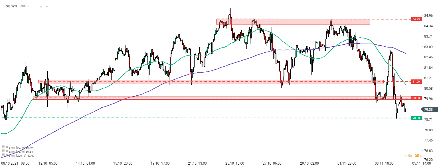 WTI (OIL.WTI) sa počas ázijskej seansy pokúsila vyšplhať späť nad hladinu 80 USD za barel, ale nepodarilo sa jej to. Cena klesla a nemožno vylúčiť opakovaný test nedávnych miním v oblasti 78,80 USD. Zdroj: xStation5