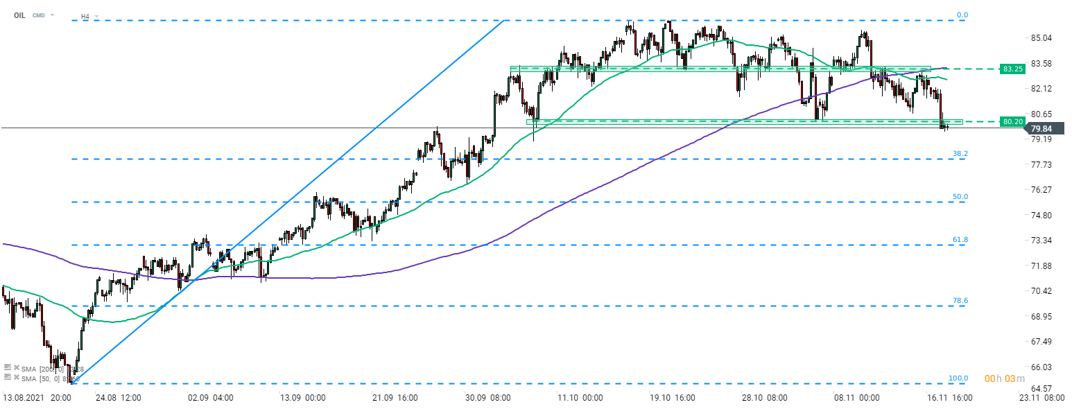 Ropa pokračuje v poklese po dosiahnutí nedávnych viacročných maxím, keď sa Spojené štáty pokúšajú prehovoriť ostatné krajiny, aby uvoľnili strategické zásoby ropy. Čína už uvoľňuje svoje vlastné rezervy. Brent (OIL) klesol pod hranicu 80,00 USD a obchoduje sa na najnižšej úrovni od začiatku októbra. Zdroj: xStation5
