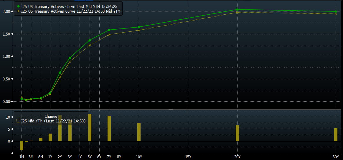 Výnosy vyskočili cez krivku po oznámení Powellovej nominácie. Najväčšie nárasty možno pozorovať v strednej časti krivky (aktuálna krivka - zelená čiara, krivka pred oznámením - žltá čiara). Zdroj: Bloomberg