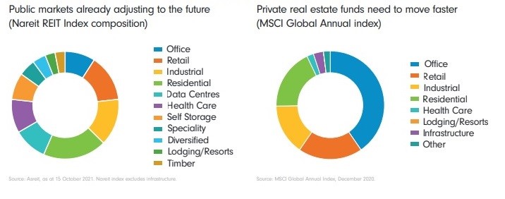 Veřejné trhy se již přizpůsobují budoucnosti (složení indexu Nareit REIT) Soukromé nemovitostní fondy musí postupovat rychleji (MSCI Global Annual index) Zdroj: Asreit, stav k 15. říjnu 2021. Index Nareit nezahrnuje infrastrukturu. Zdroj: Nareite, s. r. o: MSCI Global Annual Index, prosinec 2020.