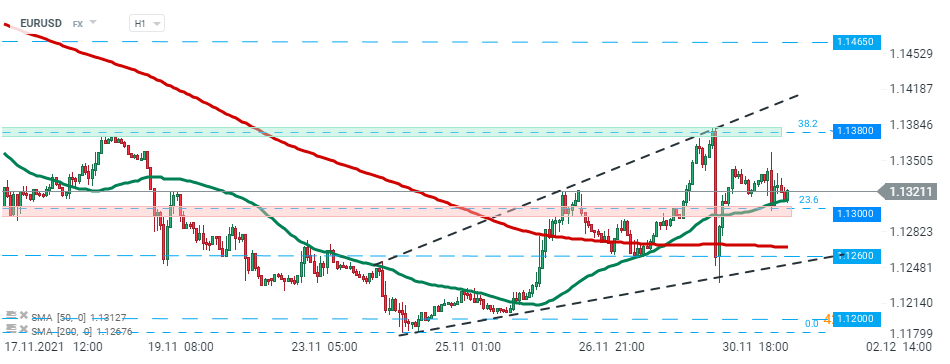 EUR/USD se odrazil od úrovně 50 SMA (zelená čára) po zveřejnění dnešních dat a mohl by směřovat k rezistenci na úrovni 1,1380. Zdroj: xStation5