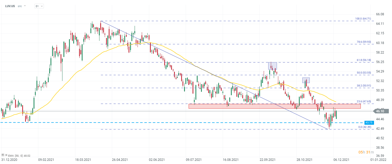 Southwest Airlines (LUV.US), interval D1. Akcie sa momentálne obchodujú v klesajúcom trende. Nedávne poklesy boli zastavené blízko minima od konca januára 2021. Cena sa odrazila od tejto úrovne a momentálne testuje zónu odporu blízko hladiny 47 USD za akciu (oblasť predchádzajúcich cenových reakcií a 50 EMA (žltá čiara)). Ak sa strane dopytu podarí prekonať tieto ukazovatele, mohlo by to povzbudiť býkov, aby otestovali posledný lokálny vrchol blízko hladiny 52,5 USD na akciu. Zdroj: xStation 5