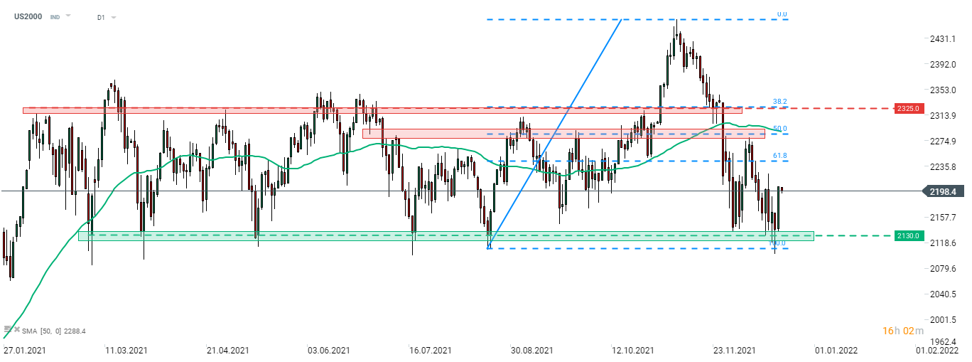 Russell 2000 (US2000) včera vzrástol takmer o 3 %, keď sa indexy z Wall Street po nedávnom výpredaji začali zotavovať. Americký index s malou kapitalizáciou sa odrazil od spodnej hranice tohtoročného obchodného rozpätia na úrovni 2 130 bodov. Dvojité dno bolo vytvorené v oblasti s výstrihom formácie 2 185 bodov. Zdroj: xStation5
