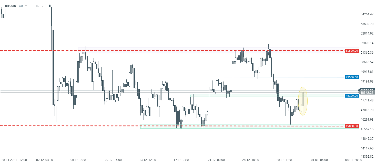 Z technického pohledu na H4 časový rámec cena Bitcoinu několik dní konsolidovala. Dokud se však nedočkáme průrazu nad rezistenci na $51 500 nebo pod support na $45 800, tak pohyb do strany je základním scénářem dalšího vývoje. Z krátkodobějšího pohledu by obchodníci měli věnovat pozornost cenovým zónám v blízkosti $48 000 a $49 500.