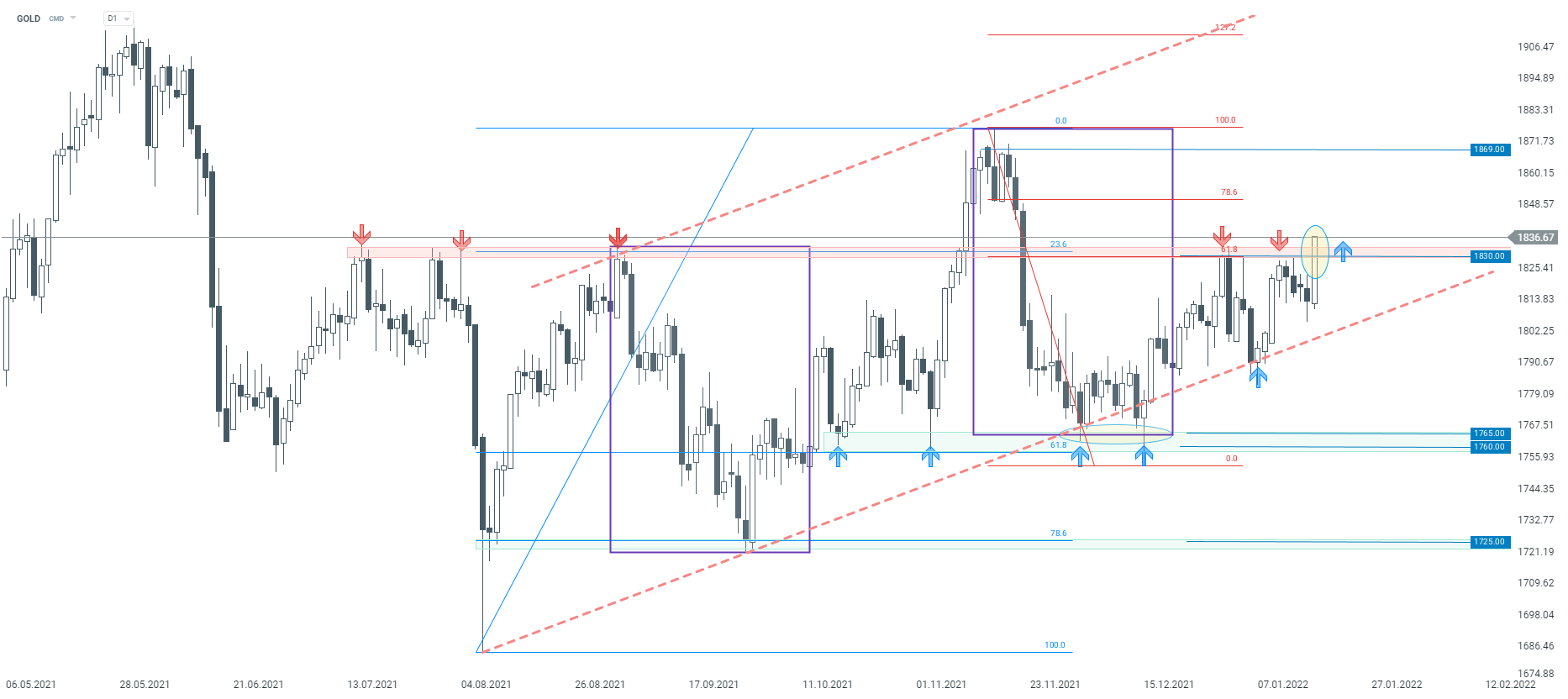 Cena zlata dokázala preraziť nad hlavný odpor, ktorý sa nachádza na úrovni 1830,00 USD, ktorý je označený predchádzajúcimi cenovými reakciami a 61,8% Fibonacciho retracementom poslednej korekcie smerom nadol. Ak prevládne súčasný sentiment, ďalší cieľ pre býkov na trhu sa nachádza okolo úrovne 1869,00 USD, kde sa nachádzajú novembrové maximá. Táto úroveň sa tiež zhoduje s hornou hranicou miestnej štruktúry 1:1. Zdroj: xStation5