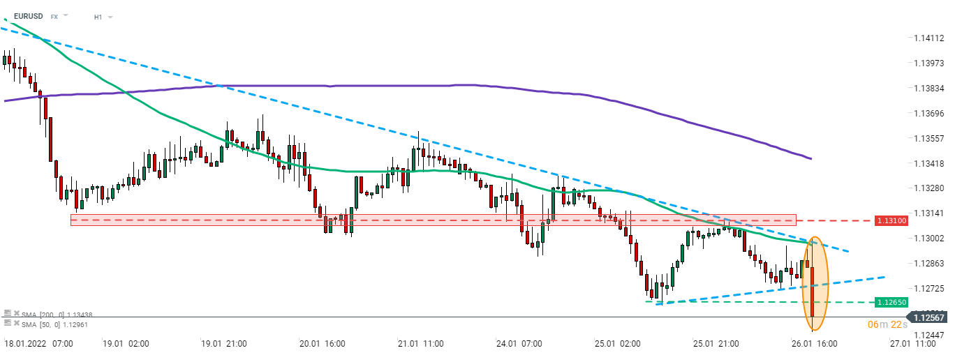 USD posilnil počas Powellovho prejavu po tom, čo predseda Fedu povedal, že nevylučuje zvýšenie sadzieb počas každého zasadnutia. EURUSD sa prepadol z 1,1300 na 1,1250 a posunul sa pod spodnú hranicu trojuholníkového vzoru. Zdroj: xStation5
