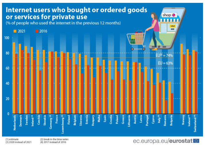 V Česku roste nejvýrazněji ze všech zemí EU podíl lidí, kteří nakupují přes internet. V roce 2016 celkem 57 procent z těch obyvatel ČR, kteří používají internet, uvedlo, že přes něj také nakupují. V roce 2021 už takto odpovědělo hned 84 procent z nich. To značí nárůst o 27 procentních bodů, který je za období let 2016 až 2021 nejvýraznější ze všech zemí EU (viz graf níže).