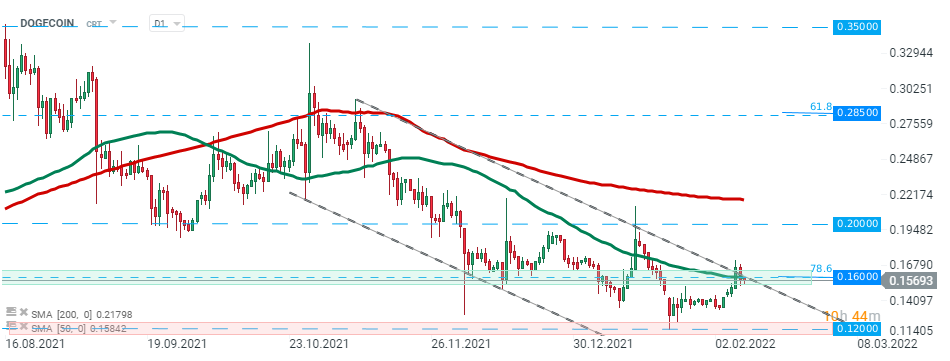 Dogecoin začal tento týden na rostoucí vlně a aktuálně testuje hlavní rezistenci v okolí úrovně $0,1600. Tam se nachází horní limita klesajícího kanálu a 78,6 % Fibo retracement růstové vlny s počátkem v lednu 2021. V případě průrazu na vyšší úrovně by dalším cílem pro býky byla cena $0,20. Pokud naopak převezmou otěže medvědi, tak se můžeme dočkat klesajícího impulsu směrem k supportu na $0,1200. Zdroj: xStation5
