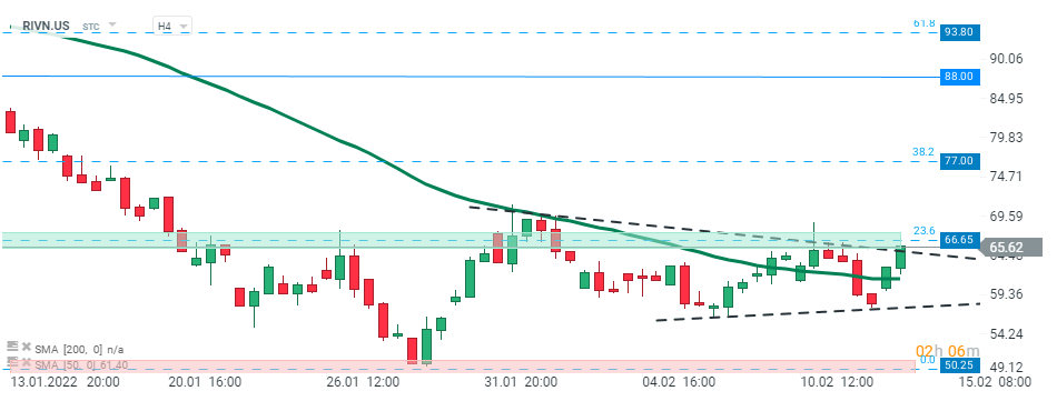 Akcie Rivian Automotive (RIVN.US) dnes prudko vzrástli a podarilo sa im preraziť nad hornú hranicu vzoru trojuholníka. Napriek tomu kupujúci stále potrebujú posunúť cenu nad 23,6% Fibonacciho retracement poslednej klesajúcej vlny. Kým cena neklesne pod túto úroveň, môže sa spustiť ďalší pohyb smerom nadol k podpore na úrovni 50,25 USD. Zdroj: xStation5
