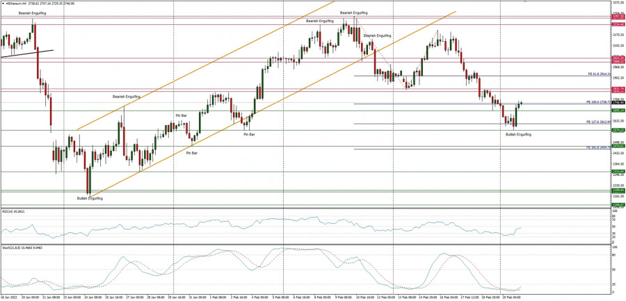 Pár ETH/USD se vrátil k úrovni 127% Fibonacciho prodloužení, která se nachází na úrovni 2 613 USD, poté, co prorazil pod klíčový krátkodobý technický support na úrovni 2 816 USD. Na konci pohybu směrem dolů, na úrovni 2 754 USD, se vytvořila svíčková formace medvědí engulfing a trh se od ní odrazil. Býci se opět přibližují k úrovni 2 816 USD, ale momentum je stále slabé a negativní.