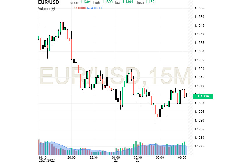 Pozitivní vliv optimistických podnikatelských ukazatelů eurozóny se však výrazně snížil v důsledku zkomplikování geopolitické situace. To vyvolalo "útěk" investorů od rizik a snížilo poptávku po rizikových měnách, zejména po té evropské. Současný stav vyvolal nerovnováhu na měnovém páru EUR/USD. V pondělí 21. února dosáhl klasický pár vysoké úrovně 1,1390, ale tyto úspěchy přišly vniveč. V úterý 22. února ráno se pár EUR/USD obchodoval na úrovni 1,1304.