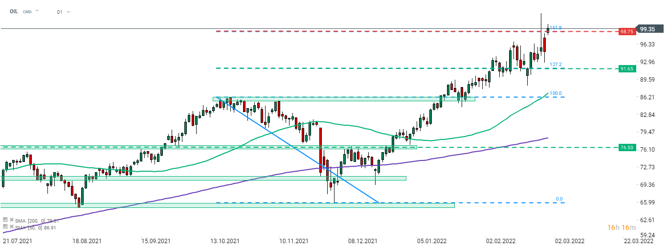Západní země se zaměřily na ruské rezervy a odřízly část ruských bank od SWIFTu. Existuje riziko, že Rusko může reagovat odvetou zastavením vývozu energie do Evropy. To by však znamenalo masivní zásah do ruských příjmů. Brent (OIL) vyskočil na začátku nového týdne a opět se obchoduje nad 99 USD. Zdroj: xStation5