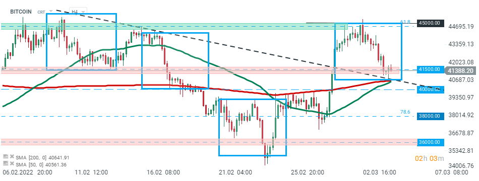 Bitcoin v pátek klesal již třetí den v řadě, jelikož válka na Ukrajině eskaluje a rostoucí ceny ropy vytlačily americký dolar výše. Hlavní kryptoměna klesla téměř o 4 % a během evropské seance testovala úroveň 41 000 $. Navzdory negativnímu sentimentu chain data naznačují, že býci jsou stále aktivnější. Podle výzkumu Santiment bitcoinové velryby za poslední tři dny provedli transakce přesahující 1 milion dolarů, což je známkou toho, že poptávka může stoupat.