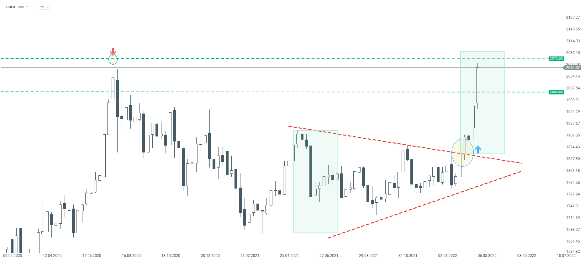 Zlato se po proražení trojúhelníkové formace nadále pohybuje výše. V současné době se cena pohybuje směrem k historickému maximu na $ 2075,00. Zdroj: xStation5
