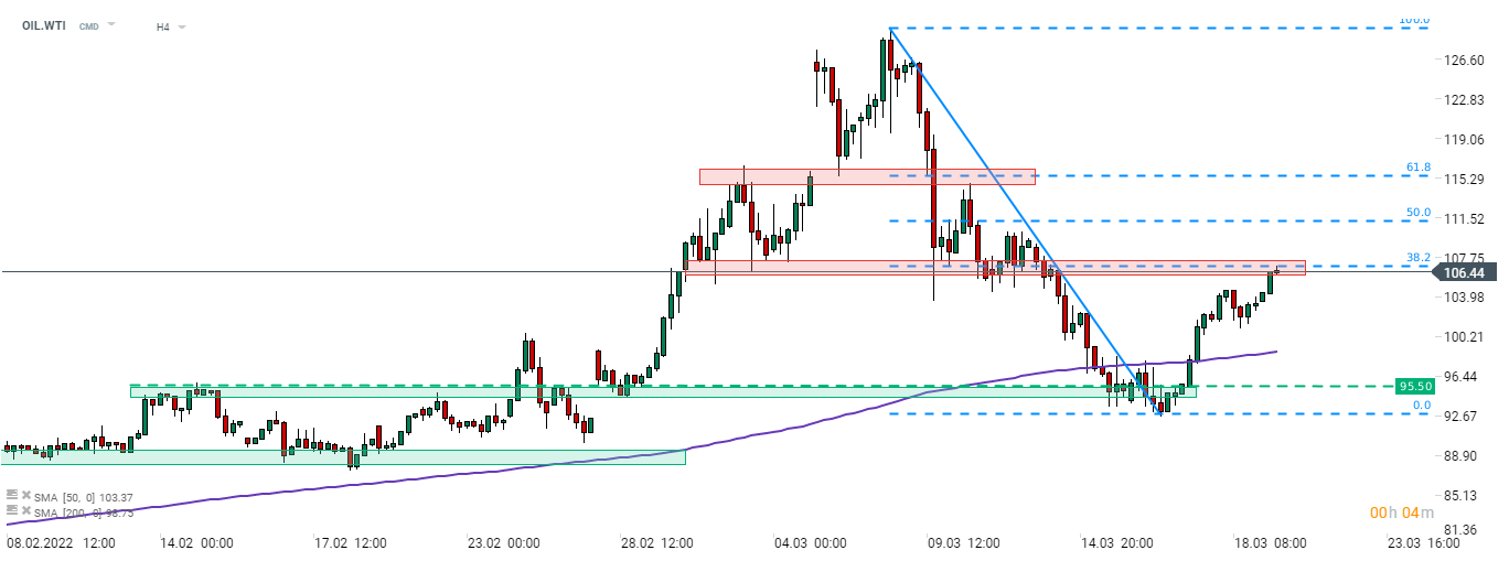 Ropa sa začiatkom nového týždňa obchoduje vyššie po správach o možnom embargu EÚ na ruskú ropu. OIL.WTI sa dnes obchoduje takmer o 3 % vyššie a testuje zónu odporu 38,2 % retracementu nedávneho poklesu (oblasť 107 $). Zdroj: xStation5