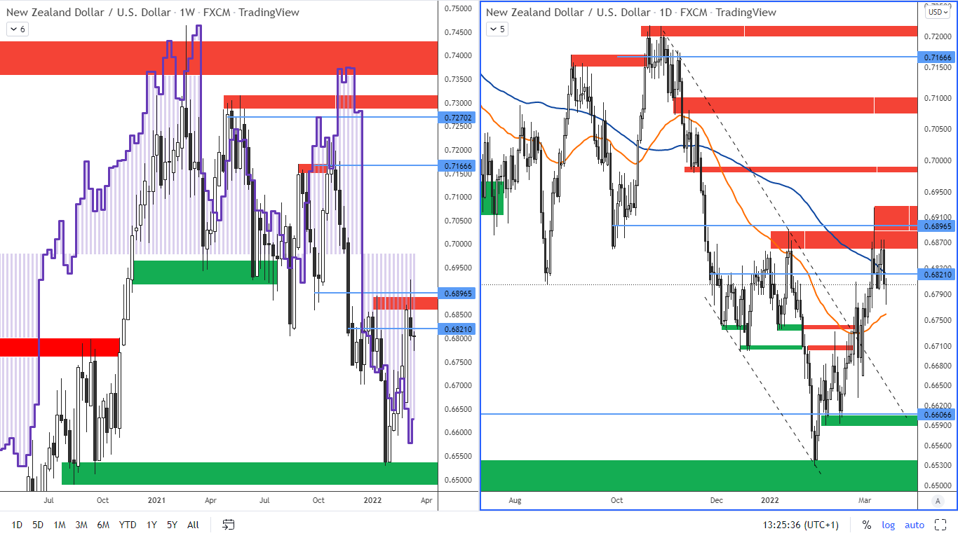 Obrázek č. 4: NZDUSD a pozice velkých spekulantů na týdenním grafu a NZDUSD na D1