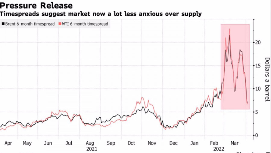 To signalizuje i "býčí" konjunktura trhu s ropou. Šestiměsíční spready mezi krátkodobými a dlouhodobějšími kontrakty WTI se aktuálně pohybují kolem 6 USD ve srovnání se 13 USD před oznámením Washingtonu o prodeji ropy ze strategických rezerv. Totéž platí pro Brent, kde se rozdíl vrátil na úrovně, které byly na začátku ozbrojeného konfliktu na Ukrajině.