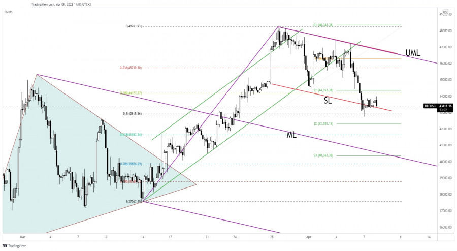 Pár BTC/USD našel podporu na úrovni 50 % (42 915) a nyní se opět obchoduje nad klesající linií kanálu nad vnitřní klouzavou linií (SL). V krátkodobém horizontu je uvězněn mezi SL a horní linií mediánu (UML).