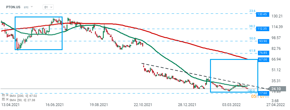 Cena akcií Peloton (PTON.US) klesá v posledním více než roce. Ztráty z maxim nyní dosahují na 85 % a zprávy o převzetí způsobily jen krátkodobou korekci. Pokud cena zůstane pod klesající trendovou čárou, tak pokračování poklesu je základním scénářem dalšího vývoje. Poteciálním cílem pro medvědy by mohla být úroveň $17,90. Pokud naopak kontrolu převezmou býci a dočkáme se průrazu nad zmíněnou trendovou čáru, tak se můžeme dočkat vyššího pohybu vzhůru. Potenciálním cílem pro býky by mohla být úroveň $67, kde se nachází horní limita struktury 1:1. Zdroj: xStation5