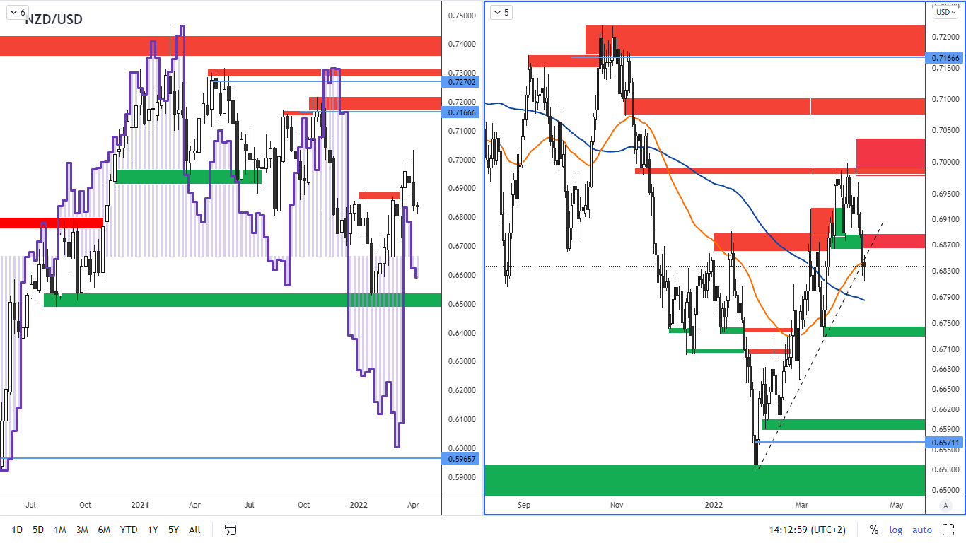 Obrázek č. 4: NZDUSD a pozice velkých spekulantů na týdenním grafu a NZDUSD na D1