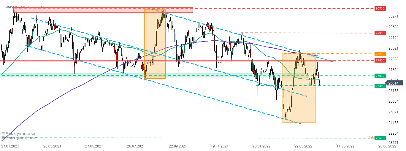 Obavy, že v Pekingu bude zavedený lockdown, narúšajú nálady na trhu začiatkom nového týždňa. Japonský Nikkei (JAP225) dnes klesol o 1,7 % a vrátil sa k minimám z polovice apríla, ktoré sa nachádzajú blízko hladiny 26 450 bodov. Zdroj: xStation5
