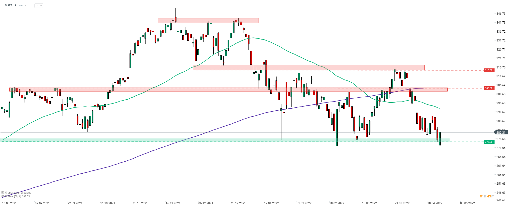 Když se podíváme na graf společnosti Microsoft (MSFT.US) na intervalu D1, můžeme vidět, že akcie se letos obchodovaly převážně do strany. Zatímco se akcie po propadu z počátku roku obchodují od začátku roku o 17 % níže, rozsah pohybů v roce 2022 byl doposud z velké části omezen na obchodní rozmezí 275–315 USD. Akcie klesly ke spodní hranici rozpětí z konce minulého týdne, ale býkům se na začátku tohoto týdne podařilo ubránit zónu supportu. Z technického hlediska jde o dobré místo pro zahájení oživení směrem k horní hranici rozpětí v oblasti 315 USD. Zóna rezistence na 305 USD označená klouzavým průměrem 200 (fialová čára) může způsobit určité zasatvení růstu.