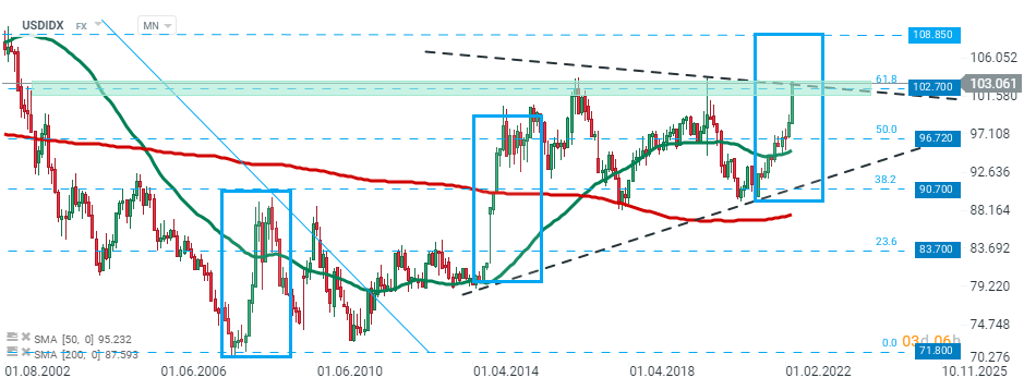 USDIDX - dolárový index v apríli prudko vzrástol a cena momentálne testuje kľúčovú zónu odporu okolo hladiny 102,70, ktorá sa zhoduje s hornou hranicou vzoru trojuholníka a 61,8% Fibonacciho retracementom poslednej vlny smerom nadol. Ak by došlo k prelomeniu vyššie, pohyb nahor sa môže zrýchliť smerom k rezistencii na úrovni 108,85, ktorá je označená hornou hranicou štruktúry 1:1. Na druhej strane, ak predajcovia znovu získajú kontrolu, najbližšia podpora, ktorú treba sledovať, sa nachádza okolo hladiny 96,72. Zdroj: xStation5