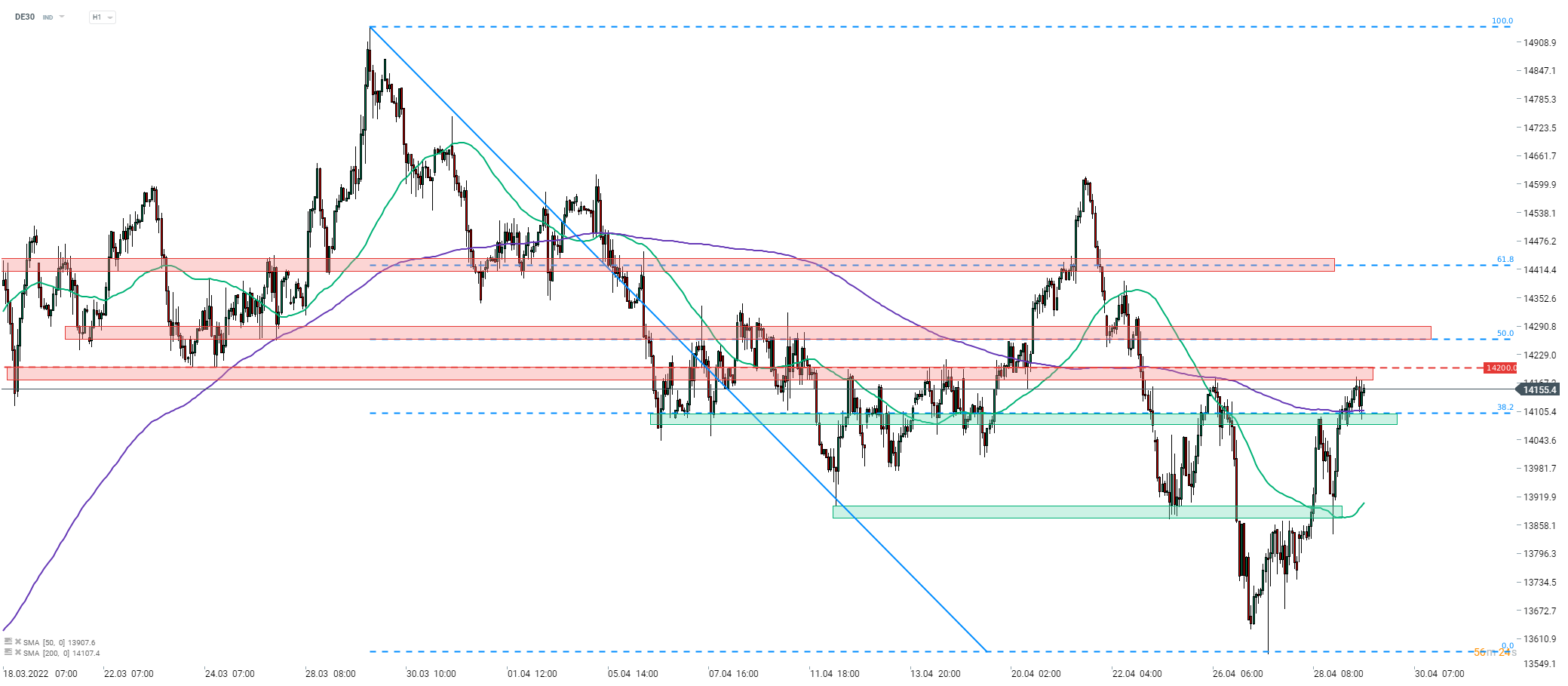 Reakce trhu na zveřejnění byla utlumená. EURUSD nezaznamenal žádné velké pohyby. Akciové indexy se pohybují ve velmi úzkém rozpětí. Když se podíváme na graf DE30 v intervalu H1, můžeme vidět, že index zůstává uzamčen mezi rezistencí 14 200 bodů a supportem označeným 38,2% retracementem.