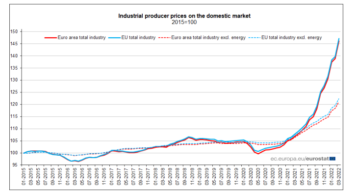 I bez nákladů na energie roste inflace producentů v eurozóně masivně. Zdroj: Eurostat