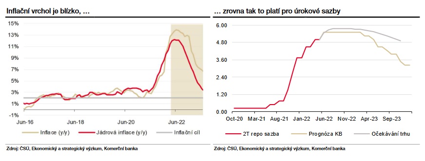 Přes obrovskou nejistotu, kterou válka na Ukrajině do ekonomických prognóz opět vnesla, tentokráte kontrastuje jednoznačné očekávání toho, o kolik dnes bankovní rady sazby zvýší. Všech 19 ekonomů oslovených agenturou Bloomberg včetně nás předpokládá zvýšení klíčové úrokové sazby o 50 bazických bodů na 5,50 %. A úplně stejně to vidí obchodníci na peněžním trhu. Samotné inflační prostředí by si zřejmě vyžadovalo ještě razantnější zvýšení sazeb. Proti tomu recese a riziko výrazných negativních dopadů válečného stavu na Ukrajině budou, stejně jako na březnovém zasedání, přispívat k umírněnosti centrálních bankéřů. Ti mají výhodu v tom, že s utahováním měnových podmínek a bojem proti inflaci začali včas a většinu práce již udělali. Dnešní zvýšení sazeb je podle nás poslední, podle trhu přijde ještě jedno zvýšení na červnovém jednání bankovní rady. A je již pouze otázkou času, kdy inflace začne zpomalovat. Na meziročních číslech předpokládáme kulminaci v tomto květnovém čase.