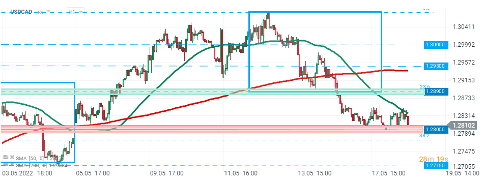 USD/CAD zaznamenal relativně malou reakci na dnešní zveřejnění údajů o inflaci. Měnový pár se blíží úrovni 1,2800. Zdroj: xStation5