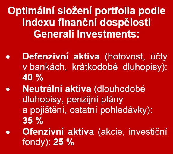 Rozložení financí českých domácností sledují analytici Generali Investments v rámci Indexu finanční dospělosti. Ten ukazuje, jak složení portfolia Čechů zaostává za ideálním rozložením běžným v západní Evropě. Index v loňském roce výrazně vzrostl, ale odstup od optimální alokace stále dosahuje propastných 38 %. Před pěti lety rozdíl činil 42 %.