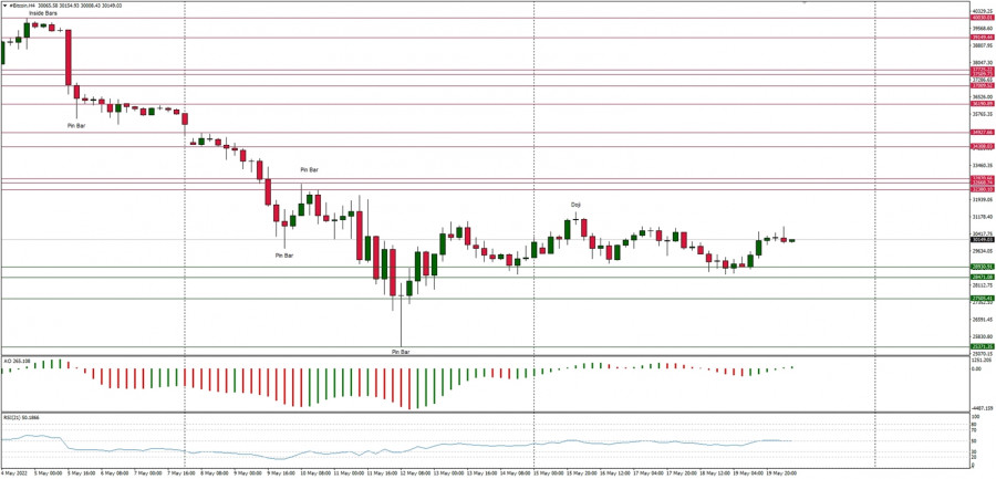 Klesající trend ve čtyřhodinovém, denním a týdenním časovém rámci pokračuje. Každý odraz a pokus o rally zatím účastníci trhu využívají k prodeji bitcoinu za lepší cenu, takže tlak medvědů je stále silný. Klíčový dlouhodobý technický support se nachází na kulaté psychologické hladině 20 000 USD.