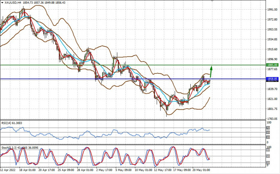 Růst a konsolidace spotového zlata nad úrovní 1 858,85 může vést k růstu k úrovni 1885,00.