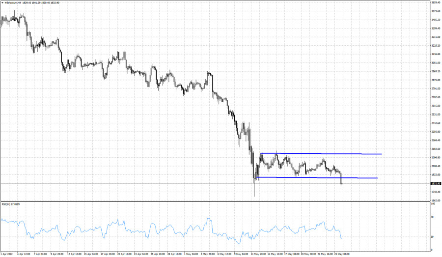 Ethereum vytváří ve vztahu k několika posledním seancím nová nižší minima. Očekáváme, že cena atakuje květnová minima přibližně na hladině 1 700 USD. Cena začala vytvářet nižší minima a nižší maxima 16. května. Dokud bude pod hladinou 2 010 USD, budou trend ovládat medvědi. Stejnou cenovou akci očekáváme i u bitcoinu.