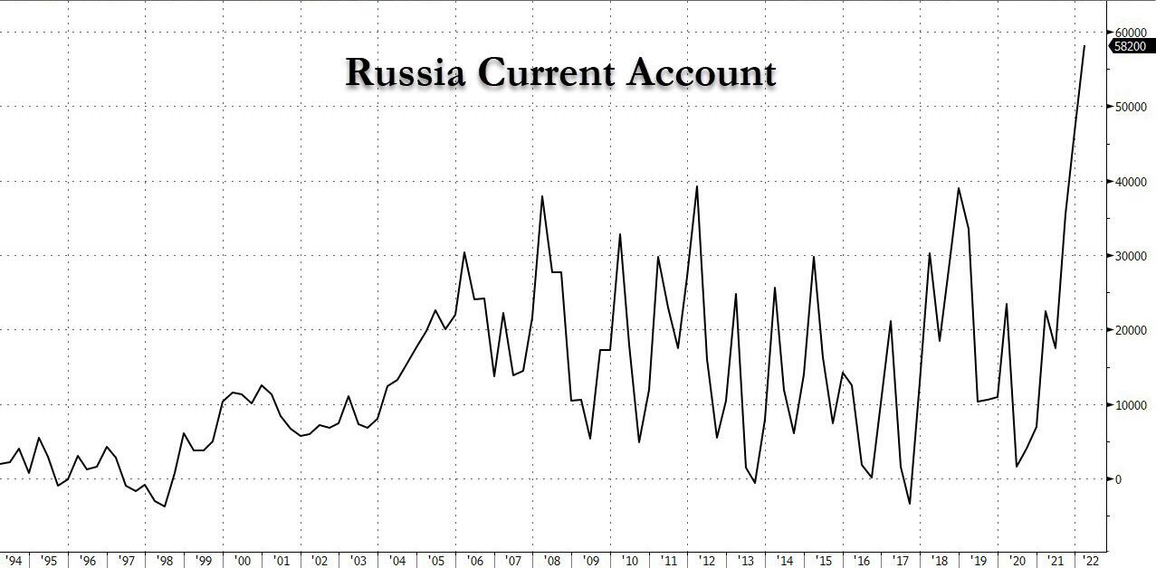Rusko posílá rekordní množství ropy do Indie a Číny. Výnosy jsou také rekordní, i když ropa prodávaná do Asie se často prodává se slevou 30 dolarů za barel. Tyto údaje samozřejmě zahrnují i exporty do EU, protože ty zatím nebyly zastaveny. Přebytek ruského běžného účtu v 1. čtvrtletí 2022 dosáhl 58,2 miliardy dolarů! Zdroj: Bloomberg, Zerohedge
