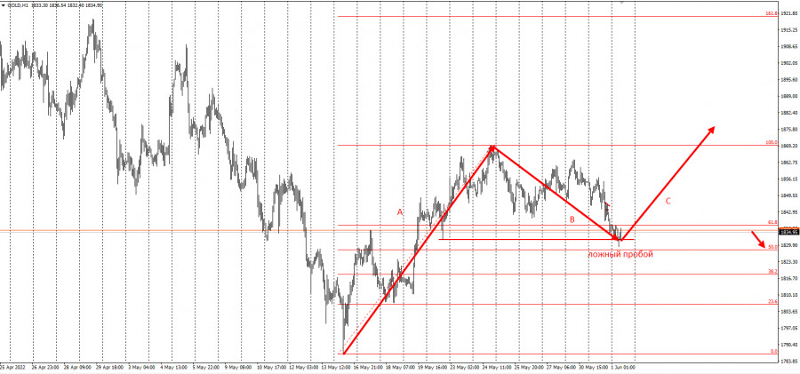 Ve skutečnosti vidíme třívlnnou strukturu ABC, kde vlna A zobrazuje nákupní impuls z poloviny května. Long pozice plánuji otevřít během 50% Fibonacciho retracementu na současných cenových úrovních. Stop loss bychom mohli nastavit na cenu 1 810 USD. Zisk bychom mohli zafixovat při průrazu ceny 1 870 a 2 075 USD.