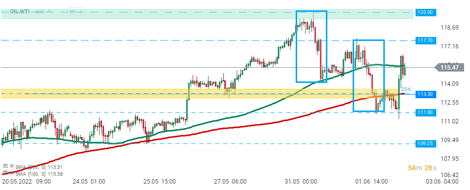 Cena WTI Crude Oil (OIL.WTI) vzrostla po dnešním zveřejnění zásob v USA a testuje úroveň 50 SMA (zelená čára). Ropa byla v posledních hodinách volatilní po zasedání OPEC. Zdroj:xStation5