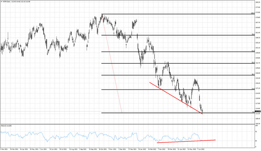 Cena akcií JPM zůstává v medvědím trendu a vytváří nižší minima a nižší maxima. Zatím nevidíme žádnou známku býčího obratu. RSI v denním grafu nám nicméně dává důležité býčí varování. Býčí divergence RSI medvědy upozorňuje, že klesající trend slábne. Cena sice vytváří nová nižší minima, ale RSI už potřetí ne. Cena ospravedlňuje obrat a odraz nahoru k Fibonacciho retracementu 23,6 % poblíž úrovně 126 USD. Dokud bude tento RSI divergovat, preferuji na JPM neutralitu. Medvědí postoj na aktuálních úrovních u JPM nestojí za rizikovou odměnu.