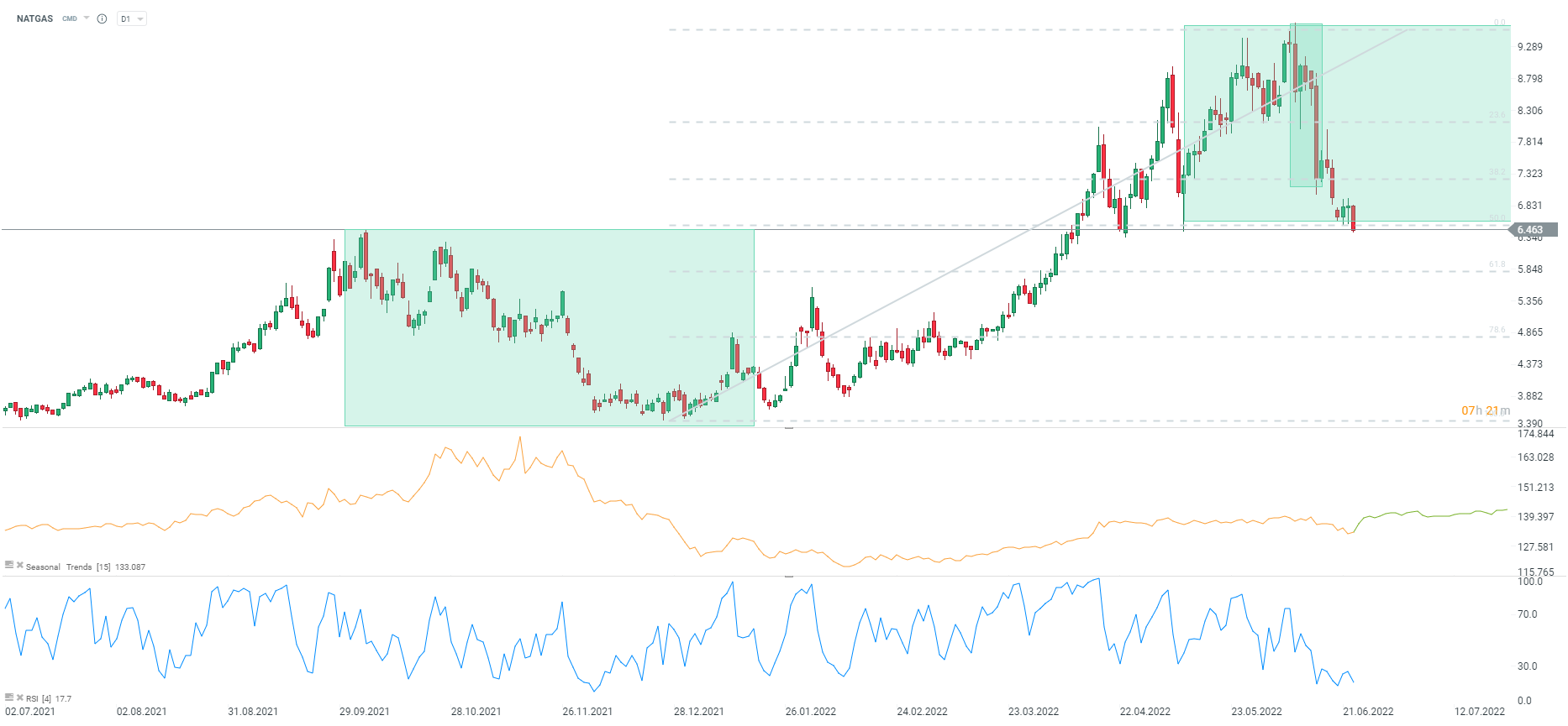 Cena plynu neustále klesá. Pokud bude nynější sentiment převažovat, cena může spadnout až na rozmezí 5-ž USD.Zdroj: xStation5