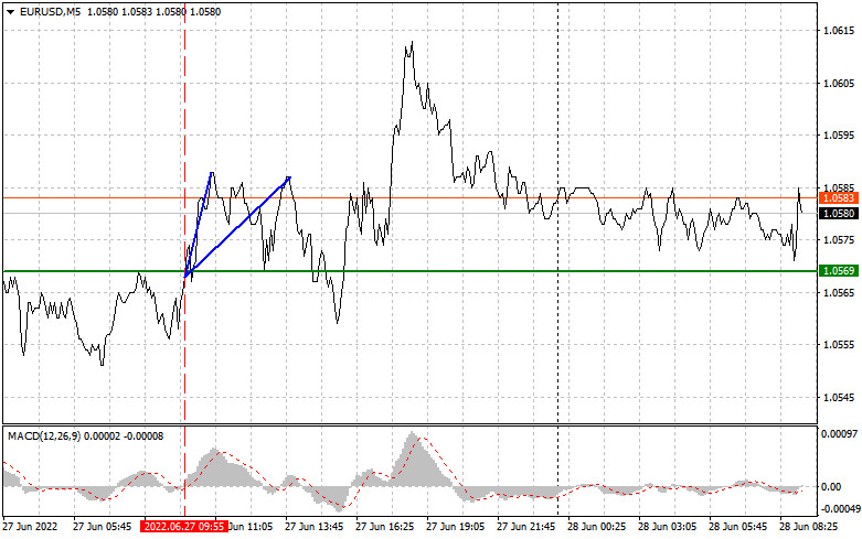 Pár EUR/USD dosáhl úrovně 1,0569, což na trhu vyvolalo nákupní signál. Shodou okolností se linie MACD právě začala pohybovat nad nulou, takže pár stoupl o více než 20 pipů. S největší pravděpodobností byl trh ovlivněn projevem zástupců ECB. Po zbytek dne se neobjevil žádný další signál.